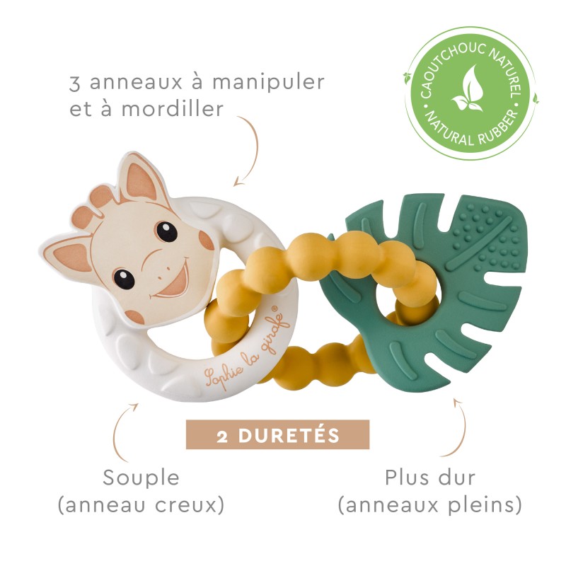 - 2 duretés : un anneau creux, souple, avec la tête de Sophie et 2 anneaux pleins, plus durs, colorés.