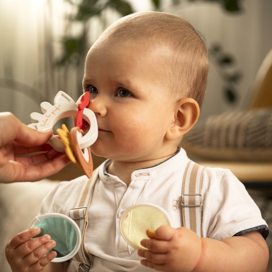 Facile à saisir et à manipuler, l’anneau senteurs se compose de 3 médaillons à la délicate odeur sucrée de vanille, fraise et coco. Subtile et légère, chacune des odeurs éveille le sens de l’odorat de bébé dès ses premiers mois et attisent sa curiosité.