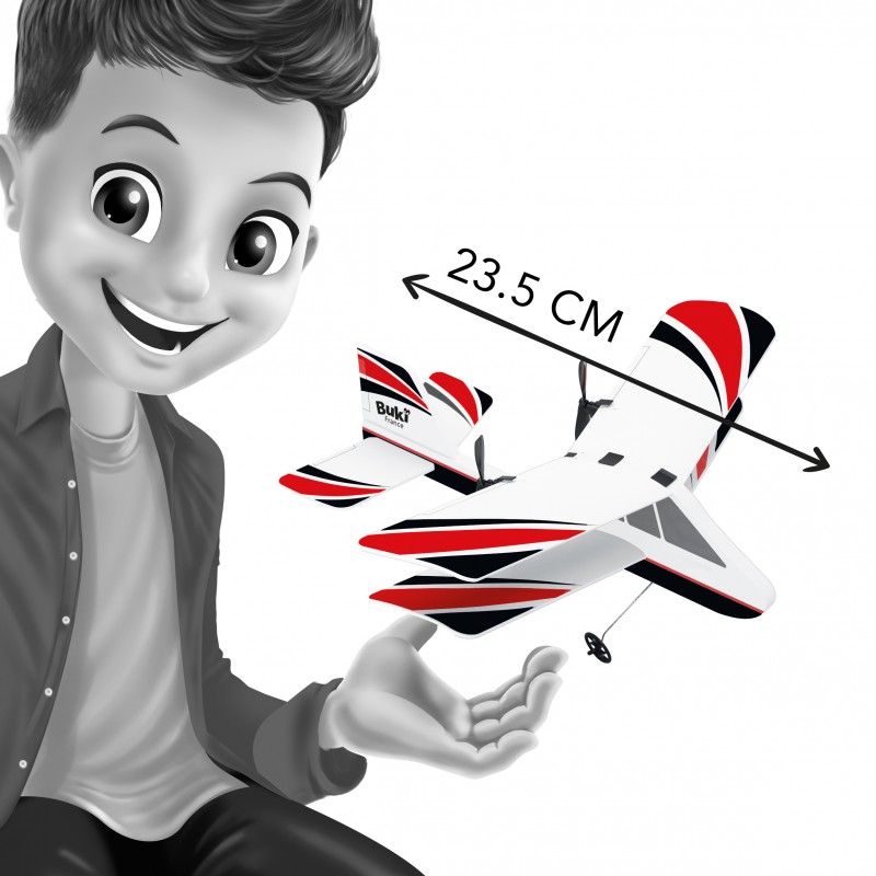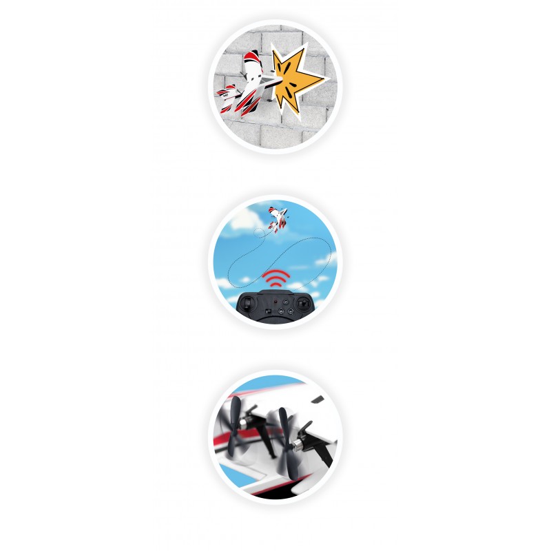 Inclus : 1 avion, 1 télécommande, roues de rechange, hélices de rechange, 1 câble USB et une notice illustrée en couleurs.