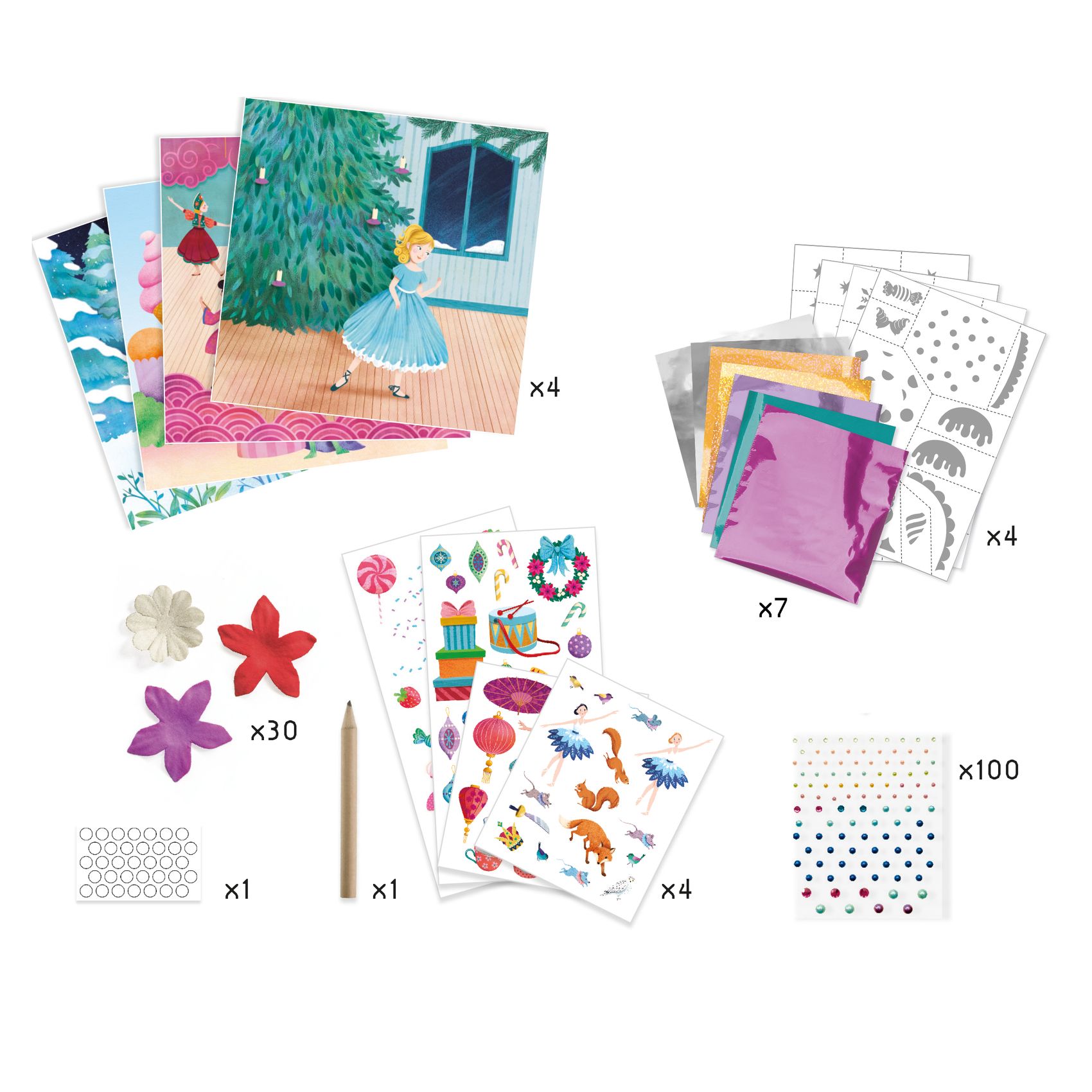 • 4 illustrations qui reprennent 4 tableaux phare du célèbre ballet : la veillée de Noël, la Valse des Flocons, les danses du Monde, le pas de deux au Palais de la Fée Dragée