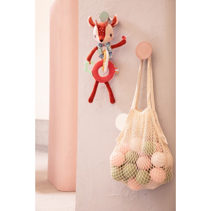 La troisième activité a été pensée spécialement pour apaiser les gencives douloureuses. Il s’agit d’un anneau de dentition en forme de fleur, accroché à la main de Stella. Toujours pratique quand bébé fait ses dents !