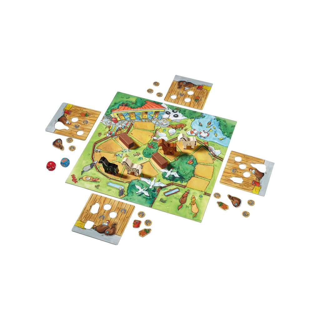 Deux dés indiquent les objets pouvant être récupérés ou le nombre de cases que le cheval peut parcourir. Celui qui choisira le bon dé en chemin réussira, avec un peu de chance, à amener en premier son cheval dans son box. Cette passionnante course de chevaux stimule la compréhension d’une première règle de jeu et participe à l’apprentissage de la prise de décisions, car il faut choisir une des deux options possibles en pesant le pour et le contre.