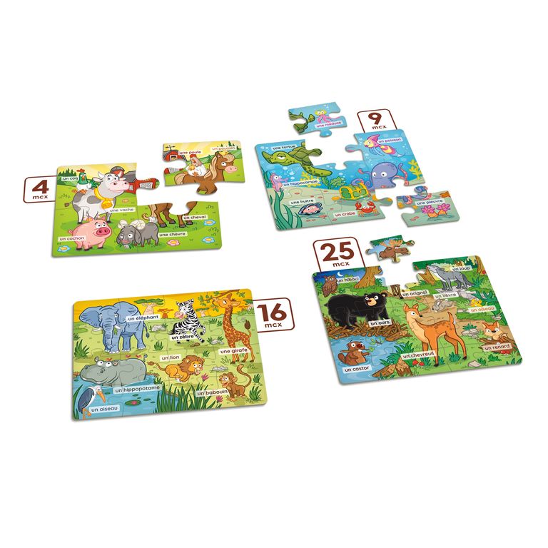 Chaque casse-tête comporte un nombre de pièces différent (4, 9, 16 et 25 pièces) pour que l’enfant puisse faire celui qui correspond le mieux à son âge ou à son niveau d’habileté au fur et à mesure qu’il grandit.