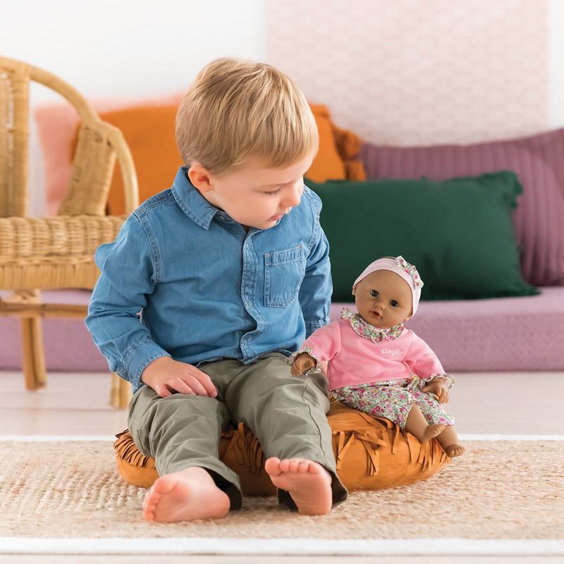 Ce petit poupon, à la peau caramel et aux yeux noirs, est habillé d’une tenue 2-en-1 composée d’un pantalon fleuri et d’un T-Shirt rose aux manches longues, et est coiffé d’un bandeau rose avec un noeud fleuri assorti à son pantalon. Votre bambin pourra facilement habiller et déshabiller Maria grâce aux bandes auto -agrippantes de sa robe.