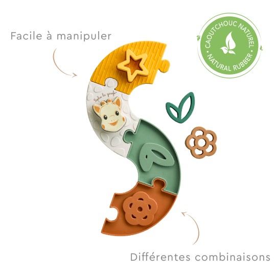 4 pièces de puzzle à assembler et 4 formes à base de caoutchouc naturel à encastrer et à mordiller.
