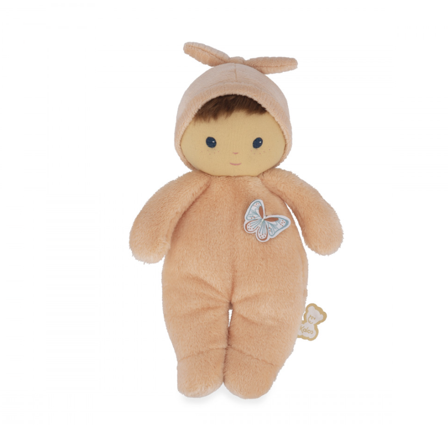 Ce délicat poupon châtain de 24 cm se distingue par son corps couleur pêche et ses yeux bleus lumineux.