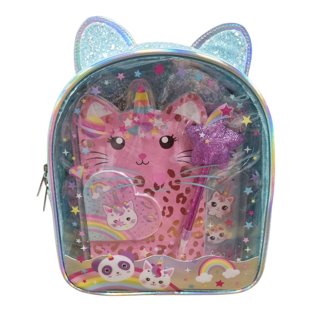 À l’intérieur, un joli set de papeterie chatcorne contenant un carnet, des autocollants et un crayon.