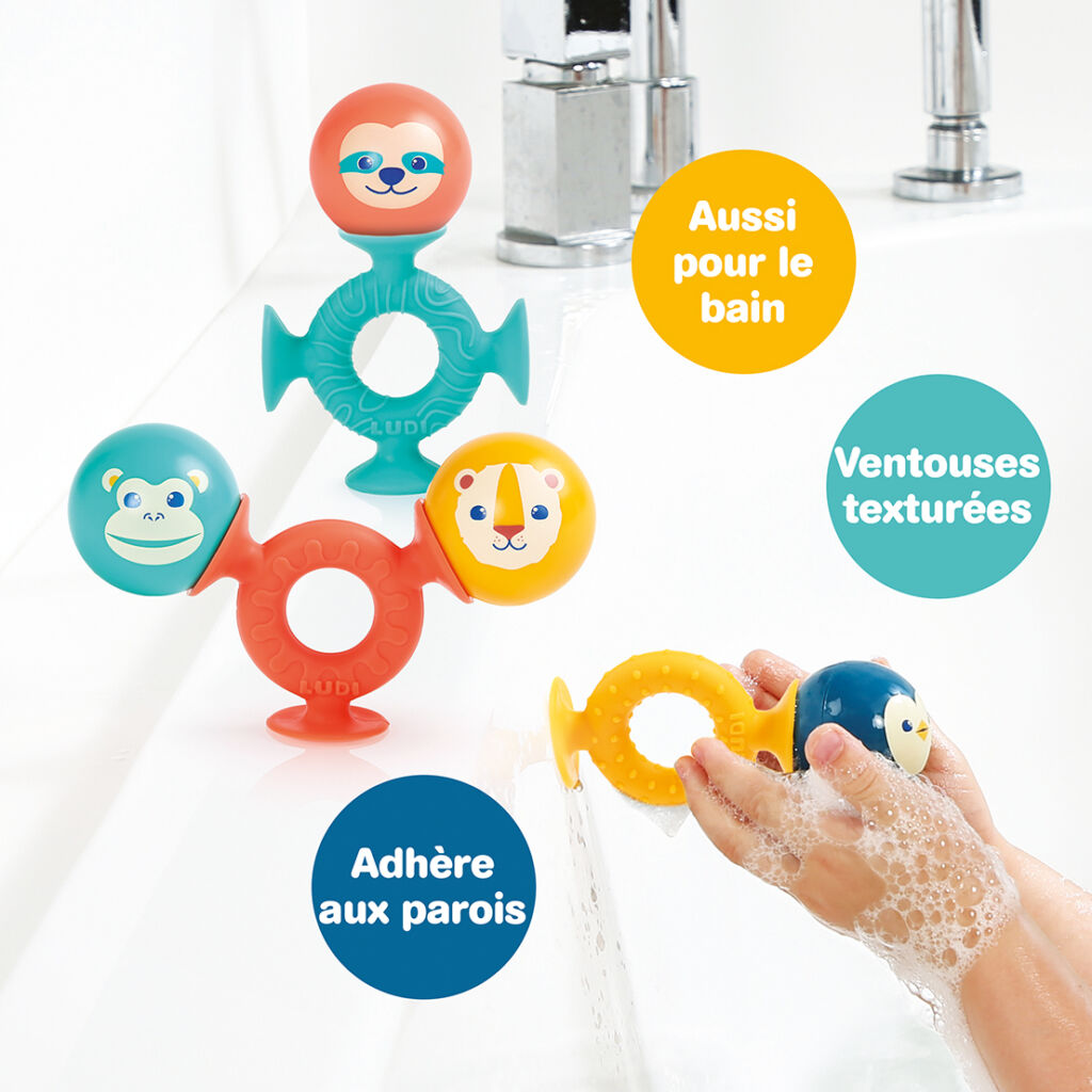 Grâce à leurs ventouses en silicone, les éléments se fixent solidement sur toutes les surfaces lisses : chaise haute, table, carrelage ou parois de baignoire. Le jeu accompagne ainsi bébé lors des repas ou du bain.