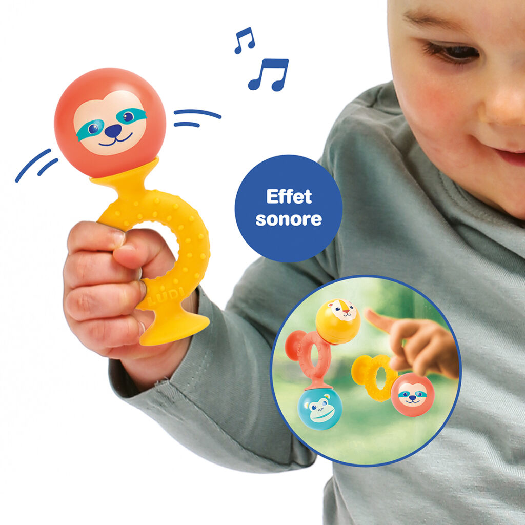 En assemblant les 4 balles sonores et les 3 ventouses de hauteurs différentes, bébé expérimente différentes formes et développe sa logique ainsi que sa motricité fine.