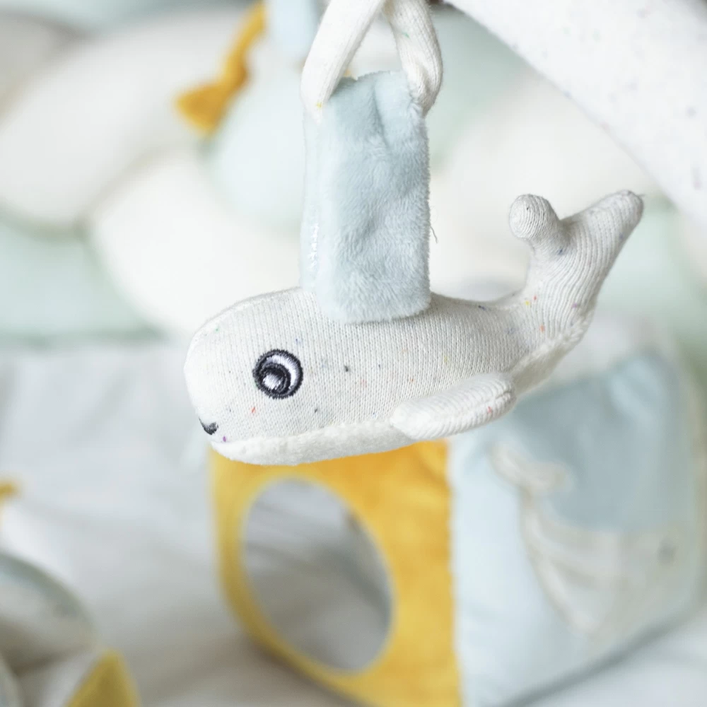 Bébé retrouvera ses amis Irène la baleine, Manu la tortue, Paulette la mouette et Bérangère l’étoile de mer du thème Au large de Nova suspendu sur l’arche. Ses doux coloris se marient facilement dans votre salon ou dans la chambre de bébé avec des tons similaires et neutres.